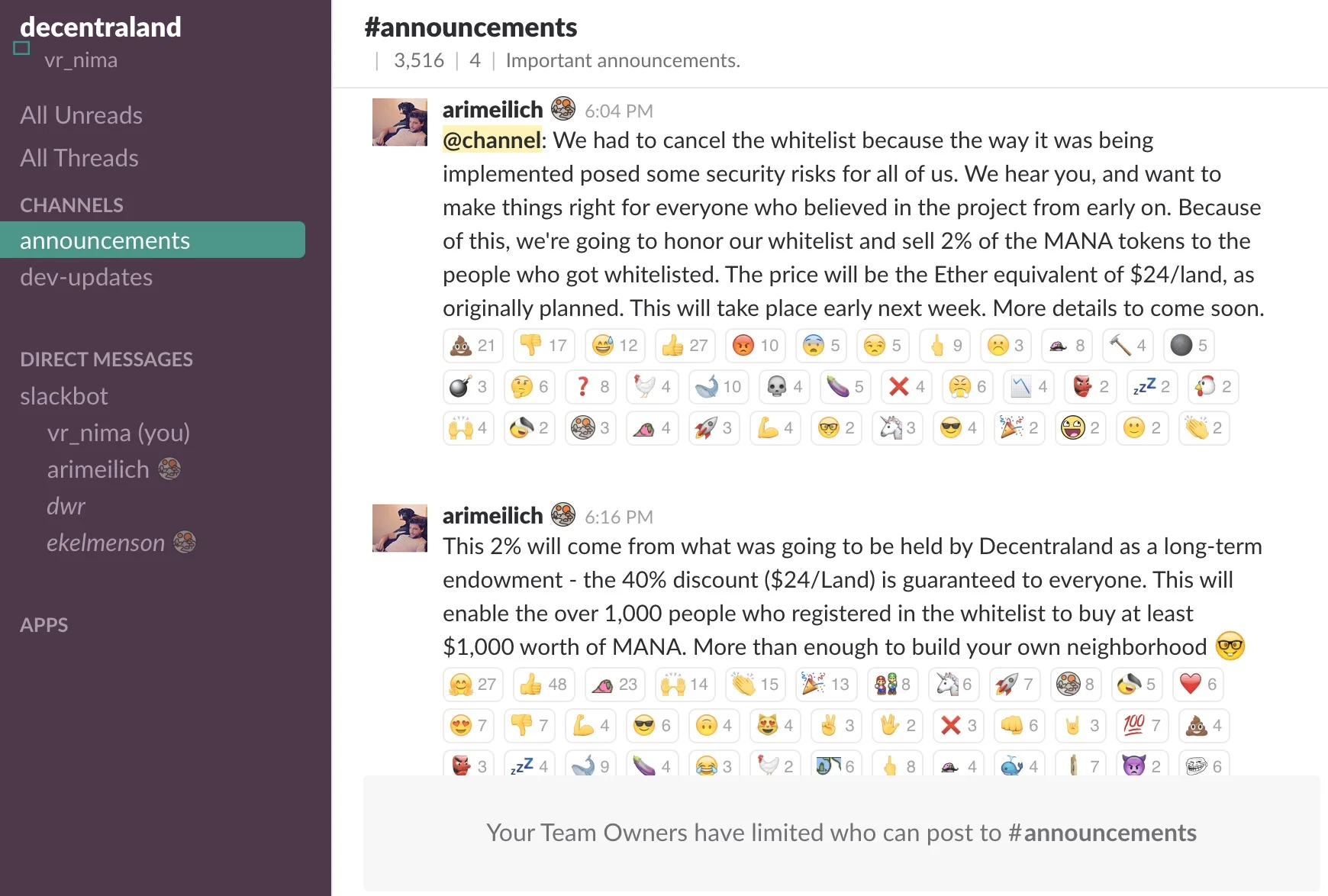 Decentraland’s community was very unique. Unlike most other projects these days, the community around it was almost completely centralized, in a Slack channel controlled by the Decentraland team. It was one universal forum where everyone could talk to their future neighbors, business partners, and the creators of the virtual world themselves. About two hours before the ICO, the Decentraland team archived and locked all the channels except two that they control, #announcements and #dev-updates. This was very strange, they’d never told us they were going to do that before this point. It was very disconcerting not to be able to talk with our fellow community members while we approached the moment we’d all been waiting for.